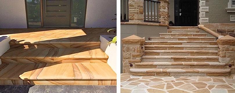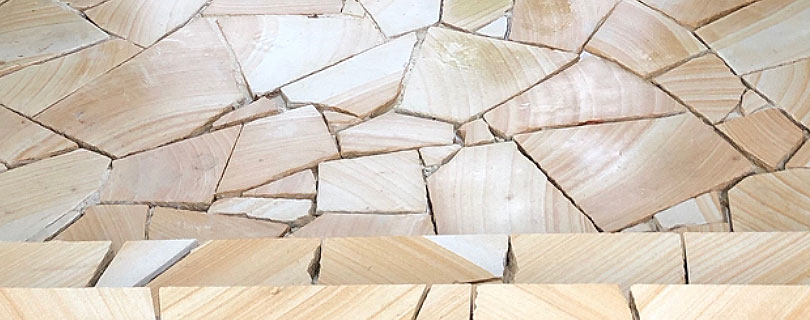 Pavers or paving stone is generally 40mm in thickness or more. The extra thickness provides strength for heavier traffic that you might find in commercial applications or on driveways. Stone pavers made from sandstone are available in a range of sizes. A range of formats and patterns are available to suit different traffic loads and substrate materials. Pavers are available in squares, rectangles as well as french and random pattern formats. Matching step treads, bullnoses, ledge tiles and capping pieces are also available. Flagstone paving options are also available, the thickness of these products are quite variable – frequently between 20 to 70mm.